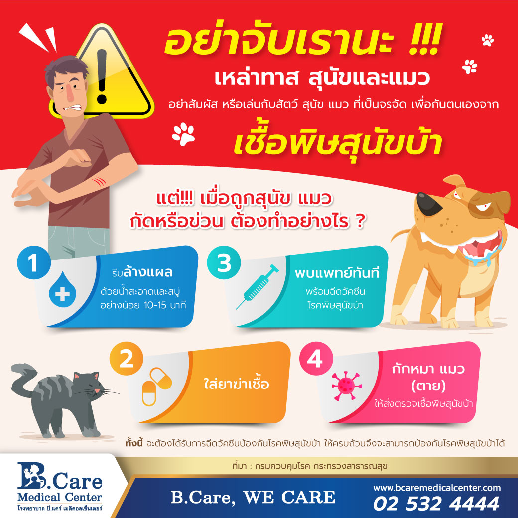 อย่าสัมผัส หรือเล่นกับสัตว์ สุนัข แมว ที่เป็นจรจัด เพื่อกันตนเองจาก เชื้อพิษสุนัขบ้า
