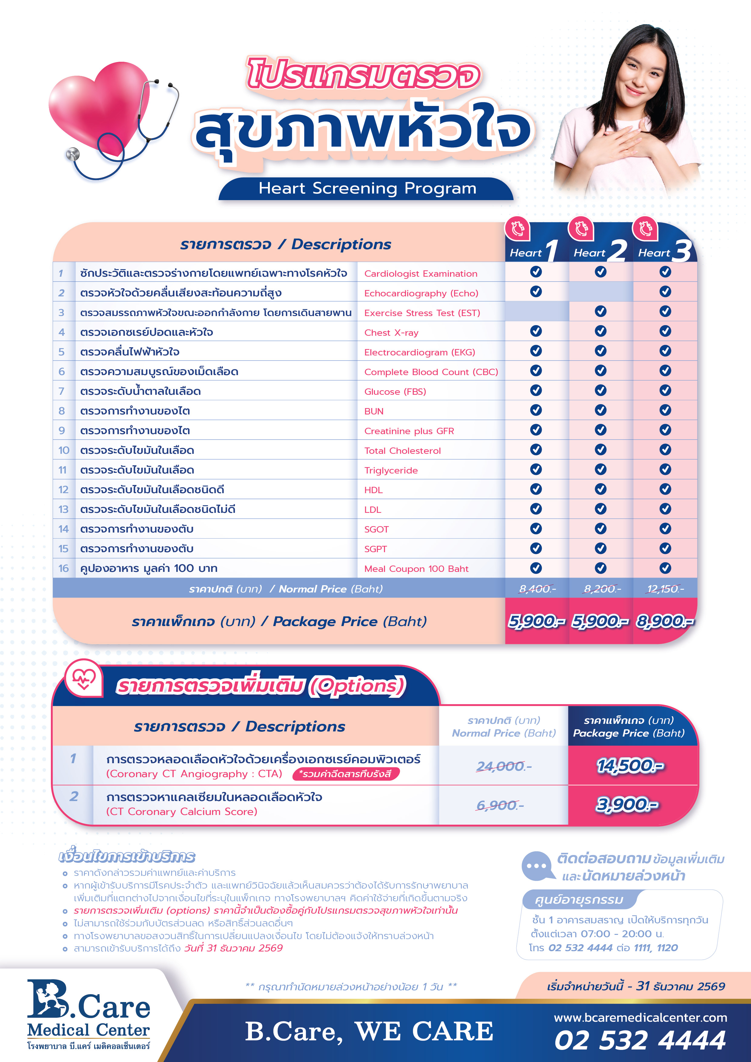 - รายการตรวจเพิ่มเติม (options) ราคานี้จำเป็นต้องซื้อคู่กับโปรแกรมตรวจสุขภาพหัวใจเท่านั้น