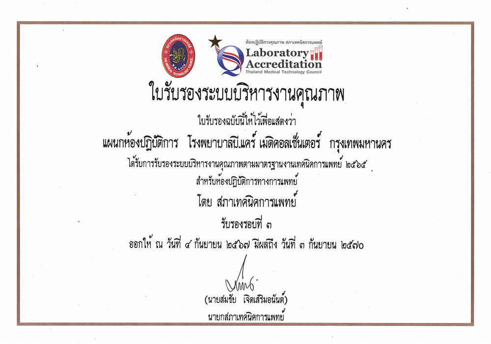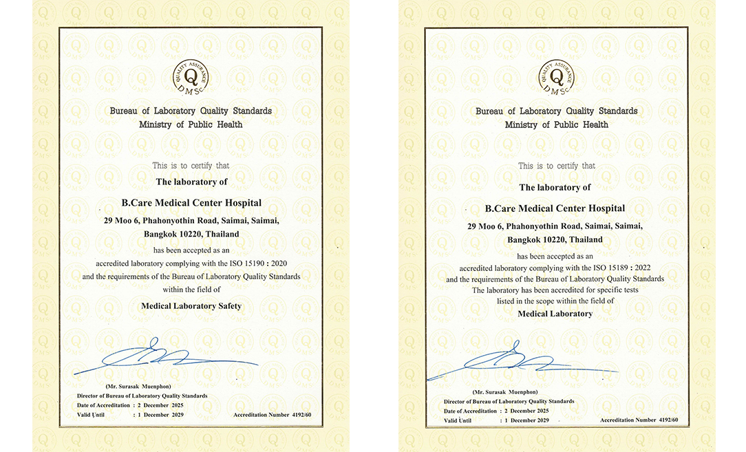 ห้องปฏิบัติการ ของทางโรงพยาบาล บี.แคร์ เมดิคอลเซ็นเตอร์ ผ่านเกณฑ์การรับรองมาตรฐานห้องปฏิบัติการ ISO 15189 : 2022 และ มาตรฐานความปลอดภัยของห้องปฏิบัติการทางการแพทย์ ISO 15190 : 2020 ซึ่งเป็นมาตรฐานระดับสากลด้านคุณภาพและความปลอดภัยของห้องปฏิบัติการทางการแพทย์ โดยสำนักมาตรฐานห้องปฏิบัติการ กรมวิทยาศาสตร์การแพทย์ กระทรวงสาธารณสุข และได้รับรองมาตรฐาน Laboratory Accreditation ; 2565 โดยสภาเทคนิการแพทย์ เพื่อยกระดับคุณภาพการตรวจวิเคราะห์ให้ถูกต้อง แม่นยำ ทันตามเวลาที่กำหนด และเป็นประโยชน์ต่อการรักษาผู้ป่วย โดยมุ่งเน้นที่มุมมองทางคุณภาพและปรับปรุงการบริการอย่างต่อเนื่องเพื่อให้เป็นไปตามมาตรฐานที่กำหนดไว้อย่างเต็มที่