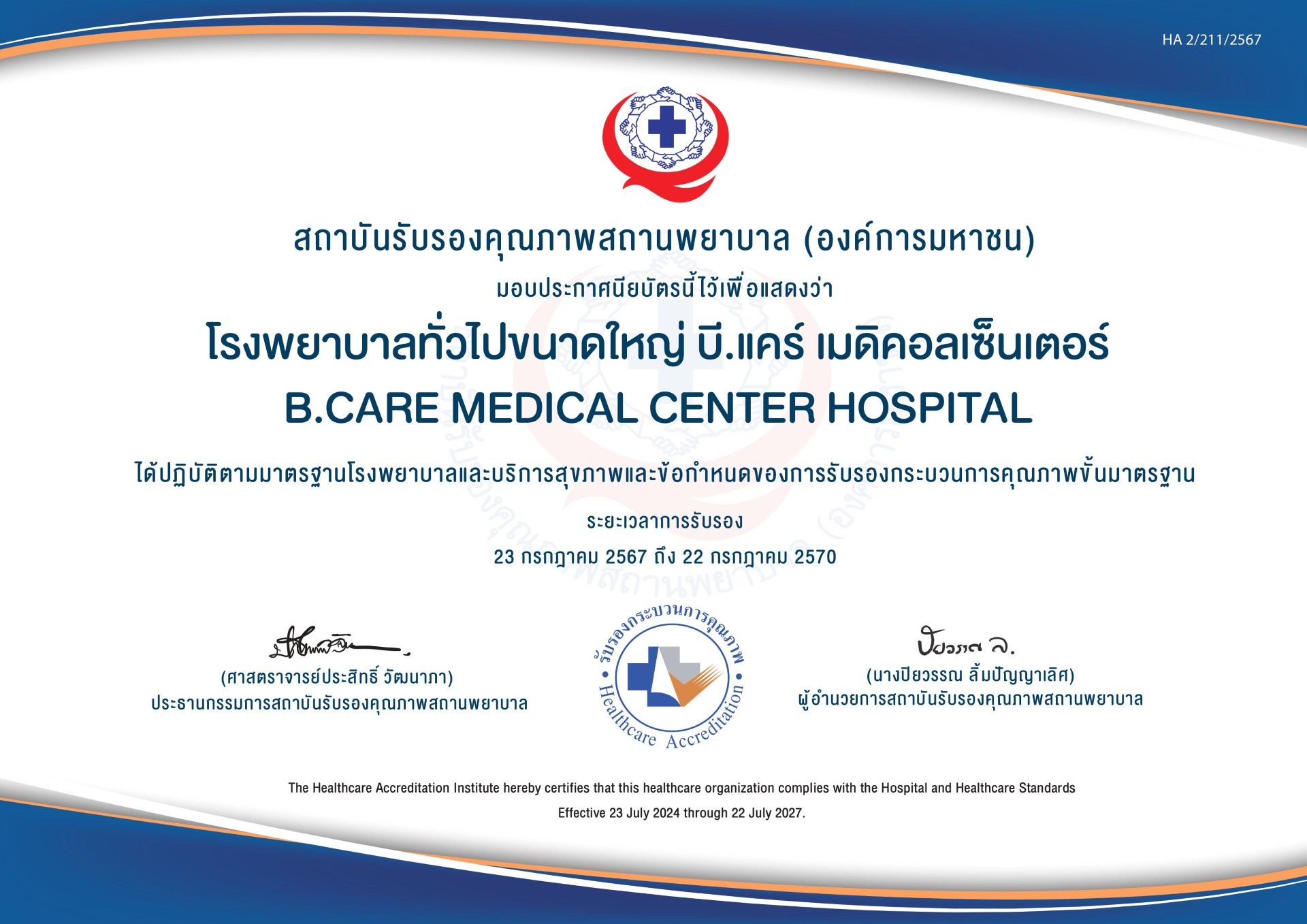 โรงพยาบาล บี.แคร์ เมดิคอลเซ็นเตอร์ ได้รับอนุมัติการต่ออายุ “การรับรองคุณภาพสถานพยาบาลที่รับผู้ป่วยไว้ค้างคืนทั้งองค์กร ขั้นมาตรฐาน ตามมาตรฐานโรงพยาบาลและบริการสุขภาพ ฉบับที่ 5” (ขั้นที่ 3) ตั้งแต่วันที่ 23 กรกฎาคม 2567 ถึง 22 กรกฎาคม 2570 จากสถาบันรับรองคุณภาพสถานพยาบาล (องค์การมหาชน)