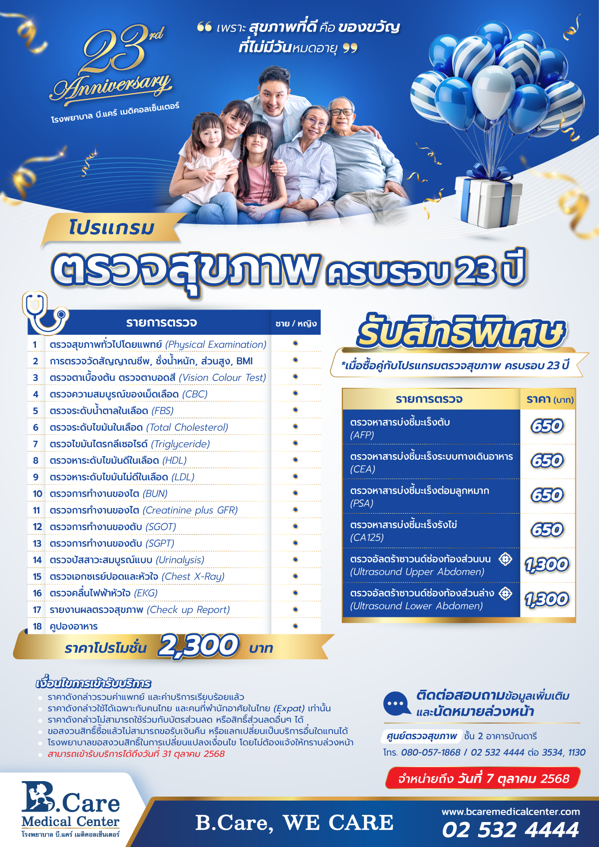 - ศูนย์ตรวจสุขภาพ ชั้น 2 อาคารบัณดารี โทร. 080-057-1868 / 02 532 4444 ต่อ 3534, 1130