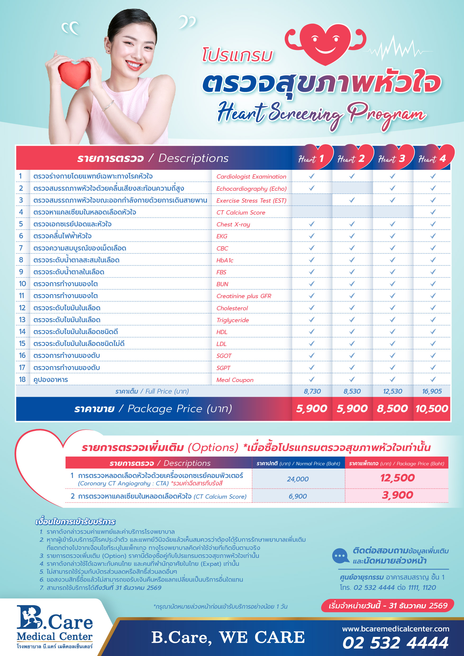 - รายการตรวจเพิ่มเติม (options) ราคานี้จำเป็นต้องซื้อคู่กับโปรแกรมตรวจสุขภาพหัวใจเท่านั้น