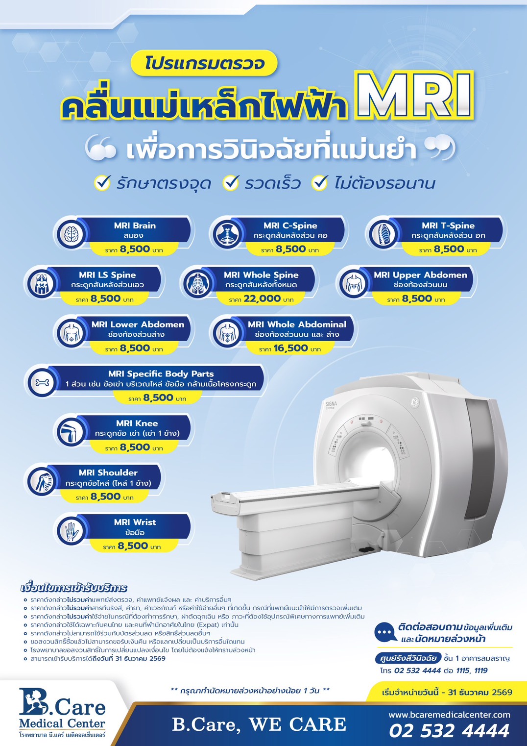 - ราคาดังกล่าวไม่รวมค่าสารทึบรังสี, ค่ายา, ค่าเวชภัณฑ์ หรือค่าใช้จ่ายอื่นๆ ที่เกิดขึ้น กรณีที่แพทย์แนะนำให้มีการตรวจเพิ่มเติม